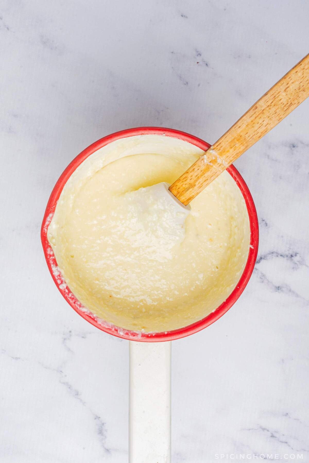 - Stir constantly until the mixture starts to bubble. Once it boils, keep stirring for about 5 more minutes until it thickens to a dough-like consistency.