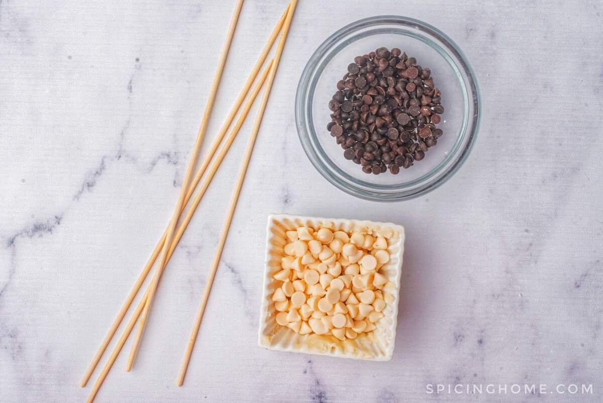 ○ Melt white chocolate and use it to glue a sprinkle onto the middle ball as the snowman’s nose.
