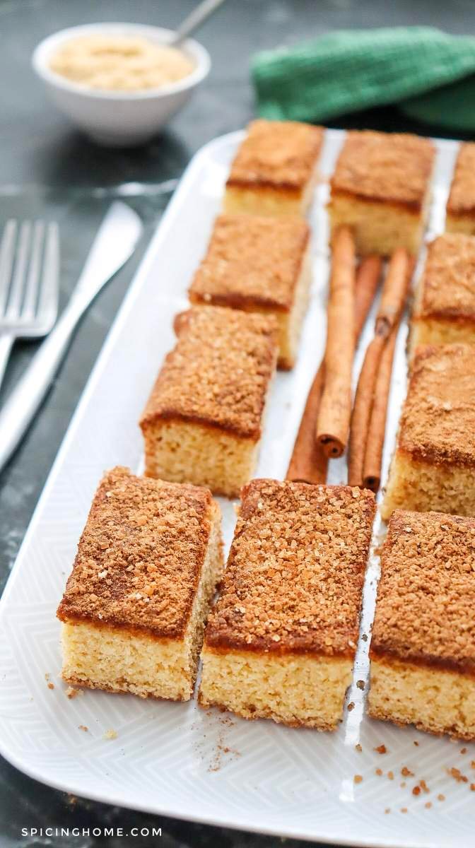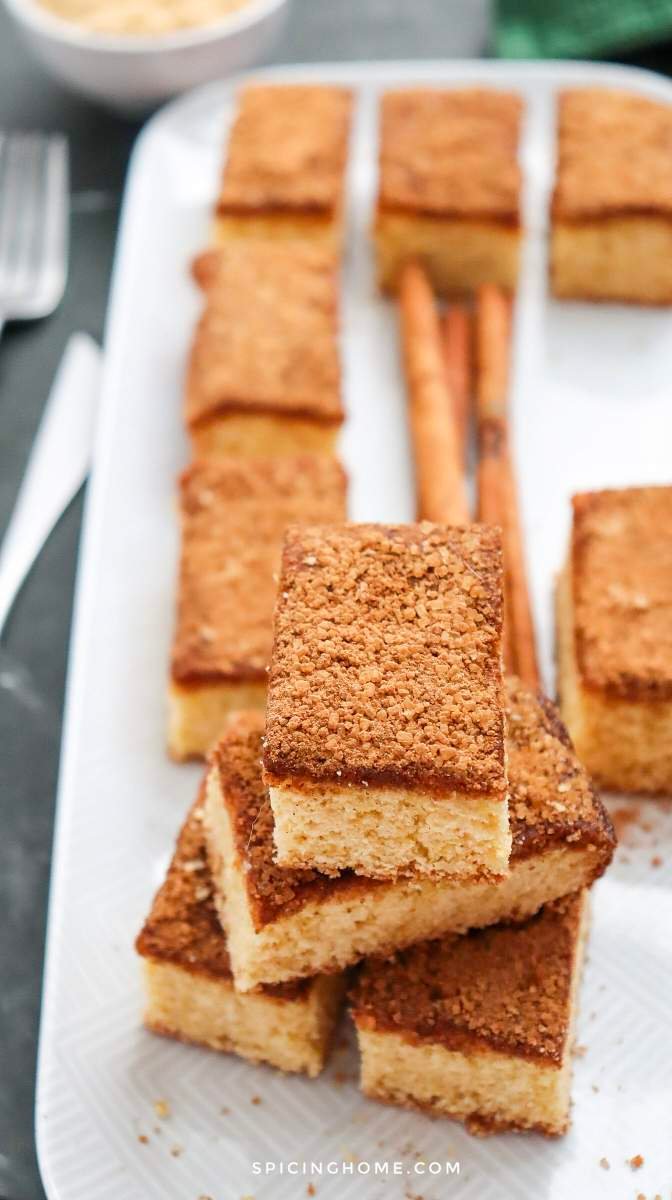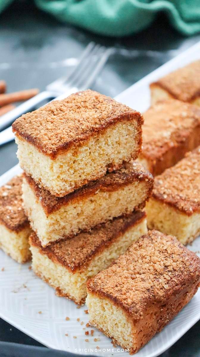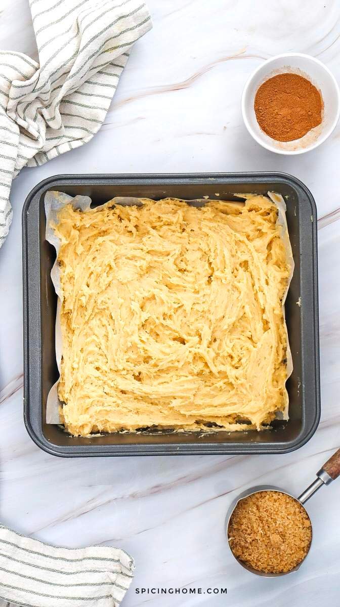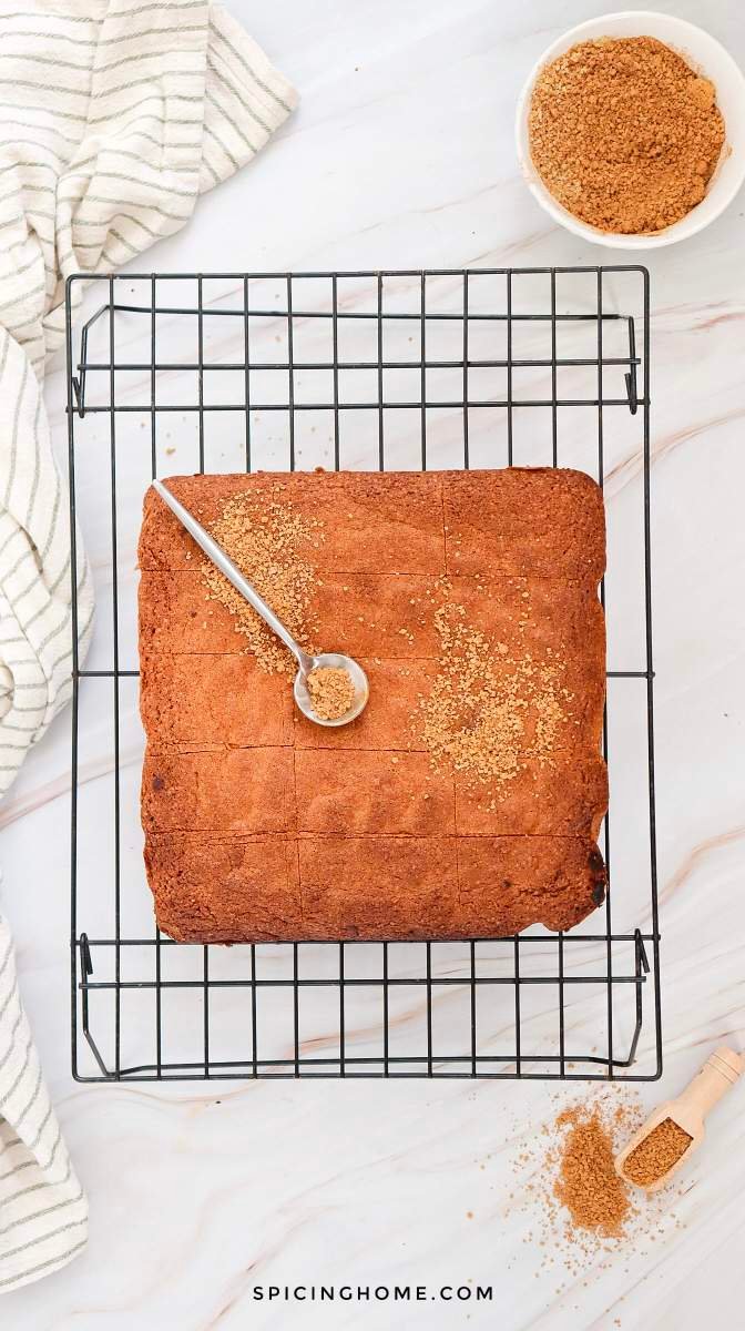 8. Cinnamon Sugar Topping: In a small bowl, combine brown sugar and cinnamon. Sprinkle this mixture evenly over the top of the dough. Once cooled, cut into squares.